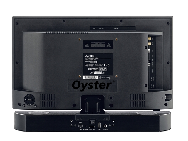 Soundbar, Fernbedienung, Montagewinkel zur direkten Montage an „Oyster TV“ (19″, 21,5″ und 24″), AUX-Kabel, COAXIAL-Kabel, HDMI ARC Kabel, Netz Adapter 110 V €¦ 240 V AC mit EUROSchuko-Stecker, Stromanschlusskabel 12 V / 24 V.