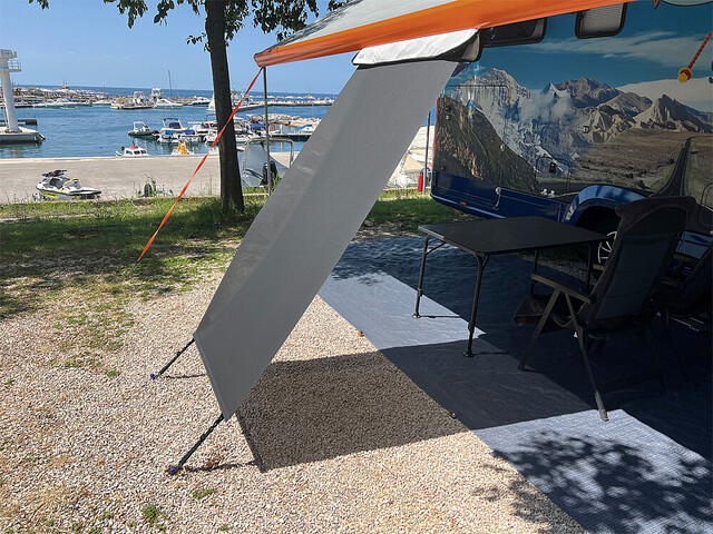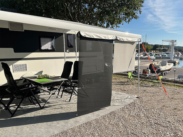 Modularer Schutz, genau da, wo er gerade gebraucht wird: Das SunBreak wird einfach in die Markisenleiste eingeführt, der Reißverschluss geöffnet und das Panel stufenlos ausgezogen. So entsteht durch das feinmaschige, luftdurchlässige Mesh genau der Sicht- oder Sonnenschutz, den man sich wünscht. Dank des cleveren Designs kann das SunBreak-Panel schnell und ohne großen Aufwand angepasst werden, wenn sich zum Beispiel der Sonnenstand ändert. Per im Lieferumfang enthaltener Abspannung lässt sich das SunBreak spannen, damit es bei leichtem Wind nicht flattert. Durch die einfach handzuhabende Einhängung gleitet das Panel leicht in jede gewünschte Position. Hinweis: Damit Beschädigungen vermieden werden, das SunBreak bei stärkerem Wind wieder in der Tasche verstauen. Wird mehr Sonnenschutz gewünscht, können weitere SunBreak in der Markisenleiste nebeneinander per Magnetverschluss zusammenfügt werden. Das SunBreak ist in erhältlich in schwarz und weiß. Das SunBreak wird wie eine Sackmarkise direkt in den Keder eingezogen. Der Keder am SunBreak ist 6 mm und passt in alle gängigen Markisen. Maximal ausrollbar auf 2 m.