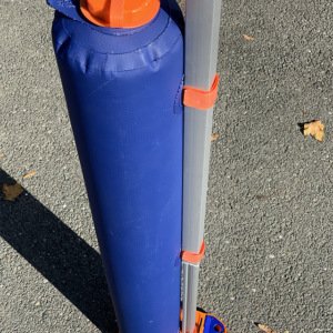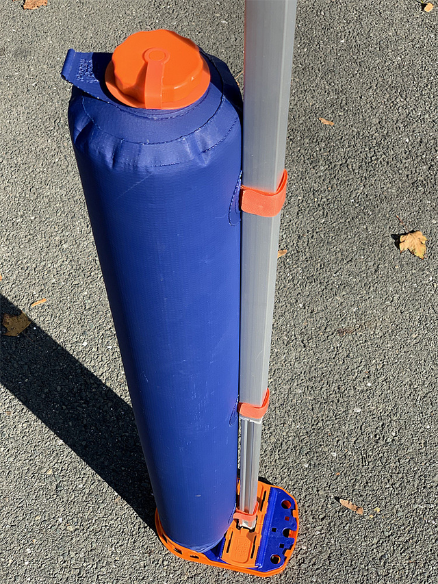 Anwendung: Den Adaptersteckschuh auf die vorhandene Fix&Go Ankerplatte am Markisenfuß stecken. Anschließend Schlauch mit 10 Liter Wasser aus Tank, See oder Fluss befüllen und in den Aufnahmekorb stellen. Fix&Go Tube mit den Klettbändern am Markisenbein befestigen – fertig! Mit insgesamt 20 kg Ballast (eine Fix&Go Tube pro Seite) lässt sich die Markise auch bei leichtem Wind verwenden. Achtung: Die Entscheidung wann der Wind für das vorhandene Gewicht zu stark wird, obliegt dem Benutzer. Fix&Go Tube ersetzt keine Markisenbefestigung am Boden!