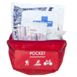 Ultrakompaktes und ultraleichtes Erste-Hilfe-Set mit 22 Artikeln Inhalt. Das Design ist für Outdoor-Aktivitäten und Reisen geeignet. Es kann dank des Klettverschlusses (verstärkt durch einen Druckknopf) an einem Gürtel, an einem Lenker oder Fahrradrahmen oder an einer Rucksackschlaufe befestigt werden.