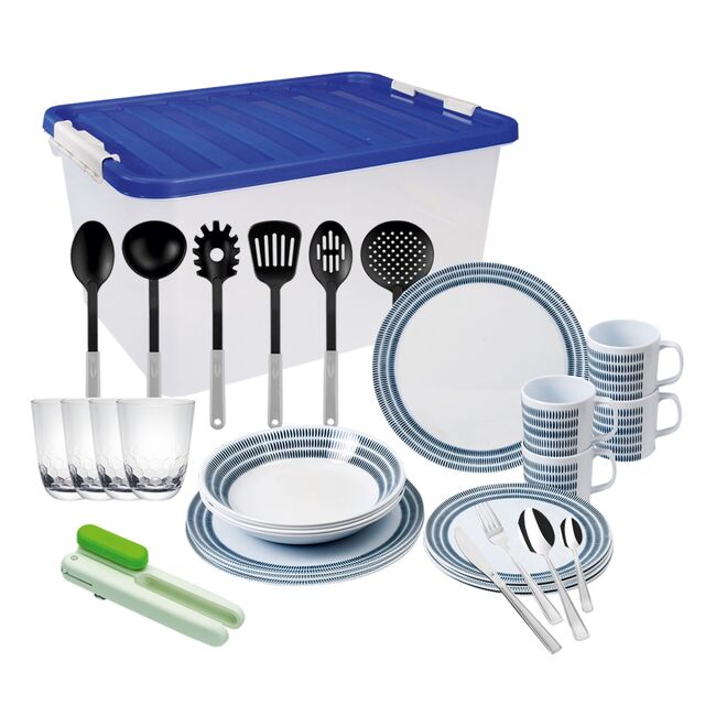 | Lieferumfang | Geschirrset Bluebay 16-tlg. , Küchenhelferset Nylon 6-tlg., 3in1 Dosenöffner, Besteckset Edelstahl 24-tlg., 4 x Wasserglas 440 ml |