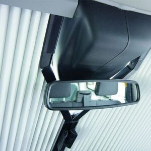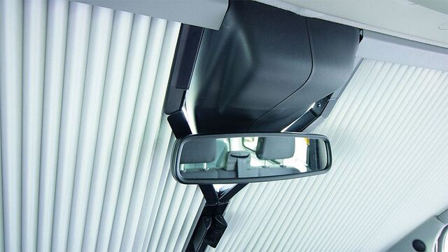 Die Frontscheibe wird durch ein zweiteiliges Verschiebeelement mit Magnetverschluss verdunkelt. Diese schließt in der Mitter der Frontscheibe, der Innenspiegel bleibt an seinem Platz.