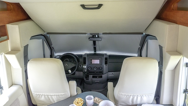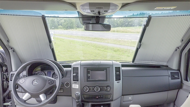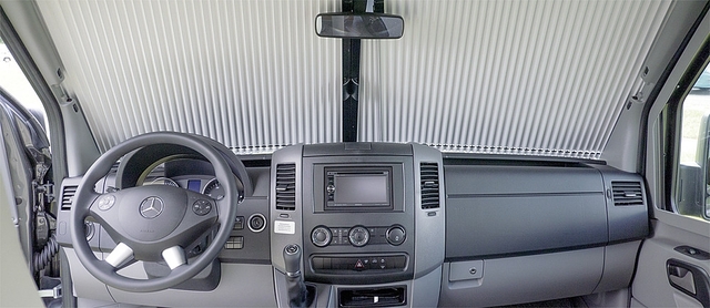 - Fahrerhausverdunklung bestehend aus dem Plissee-Faltsystem für die Frontscheibe und den beiden Verdunklungen für die Seitenscheiben
