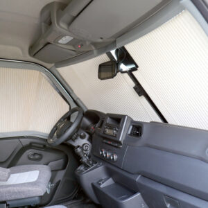 - Fahrerhausverdunklung bestehend aus dem Plissee-Faltsystem für die Frontscheibe und den beiden Verdunklungen für die Seitenscheiben