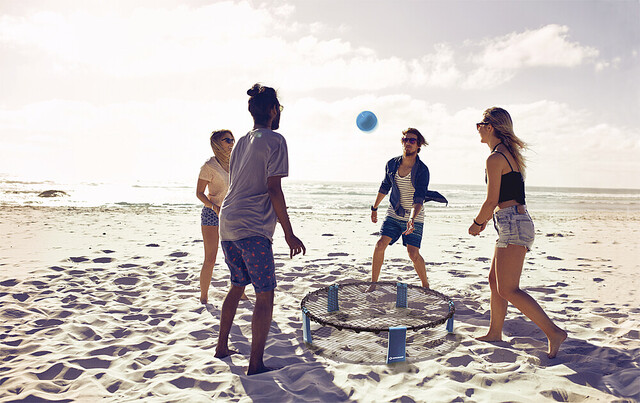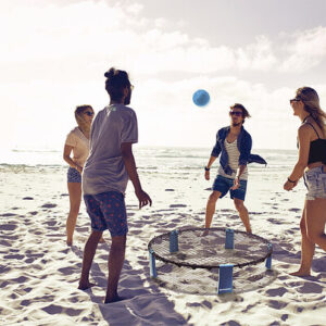 Roundnet heißt der neue ultimative Fun-Sport für Jung und Alt. Zwei Teams mit je 2 Spielern treten gegeneinander an. Alle stehen gleichmäßig verteilt um das Netz herum. Zum Aufschlag wird der Ball mit der flachen Hand auf das Netz geschlagen, so dass er in die gegnerische Seite fliegt. Das gegnerische Team darf sich nun den Ball bis zu drei Mal gegenseitig zuspielen, bevor er wieder ins Netz geschlagen werden muss. Ziel ist es, dass der so geschlagene Ball möglichst nicht von der gegnerischen Mannschaft erreicht wird. Nach dem Aufschlag darf sich jeder Spieler völlig frei rund um das Netz bewegen. Dies macht das Spiel so rasant. Mit kurzen und langen Pässen, mit vorgetäuschten Angriffen und anderen Tricks versucht man den Gegner aus der Reserve zu locken. Schafft dieser es nicht den Ball zurückzuspielen und fällt der Ball auf den Boden, bekommt das eigene Team 1 Punkt. Sobald ein Spieler behindert wird, erhält dieser ebenfalls 1 Punkt. Wer als erster 21 Punkte erreicht hat und dabei mit 2 Punkten Abstand in Führung ist, hat das Match gewonnen. Das Set beinhaltet alles für den sofortigen Start eines Roundnet-Matchs: komplettes Roundnet Netz (Ø 90cm, ca. 20cm hoch), 1 Trainingsball (Ø11cm), 2 Wettkampfbälle (Ø9cm), Ballpumpe mit Nadel sowie eine Netztasche zum Verstauen und Transport. Bitte beachten Sie, dass sich die Nadel der Pumpe im Handgriff befindet. Bitte die Bälle mit maximal 0,5 bar aufpumpen. Der neue ultimative Fun-Sport für Jung und Alt. Roundnet kann mit Freunden und Familie am Strand, im Park oder auch Indoor gespielt werden. Das rasante Spiel begeistert jeden und man findet schnell interessierte Mitspieler. Über Schildkröt: Die über 100 Jahre alte deutsche Marke Schildkröt gilt als Erfinder des Tischtennisballs. Heute bietet Schildkröt neben Tischtennis auch eine sehr umfangreiche Funsport-, Rollsport- und Fitness-Kollektion an und gilt in gewissen Bereichen als Marktführer. Die Produktentwicklung erfolgt ausnahmslos in Deutschland. Die weltweiten Produktionsstätten werden streng überwacht und genügen höchsten Sozialstandards.