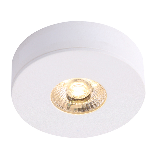 Spannung 12 VDC. Leistung 2,5 W. Lichtfarbe 3.000 K. Helligkeit 190 lm. Höhe 19,5 mm. Durchmesser 60 mm. Einbautiefe 14 mm. Lochausschnitt 50 mm. Dimmbar.