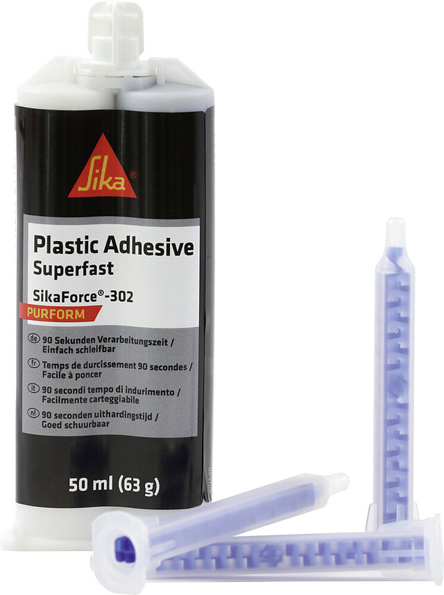 SikaForce®-302 ist ein zweikomponentiger Polyurethanklebstoff mit hervorragenden Haftungseigenschaften. Das Produkt wurde speziell für die Kunststoffreparatur an Stossstangen und anderen Kunststoffteilen entwickelt. Schnelle Aushärtung nach 1,5 Minuten, schleifbar nach 10 Minuten. Sehr niedriger Gehalt an monomeren Diisocyanaten und fällt daher nicht unter die REACH Verordnung.