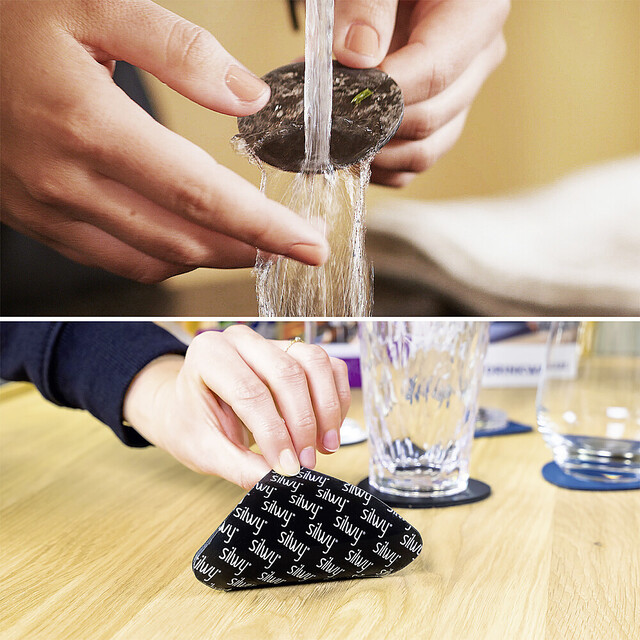 Standsicherer TO-GO-CUP aus Porzellan. Die metallischen Nano-Gel-Pads sind abwaschbar, rückstandslos entfernbar und wiederverwendbar. Stehend im Schrank mit den silwy Pads oder der silwy Metall-Matte verstauen.