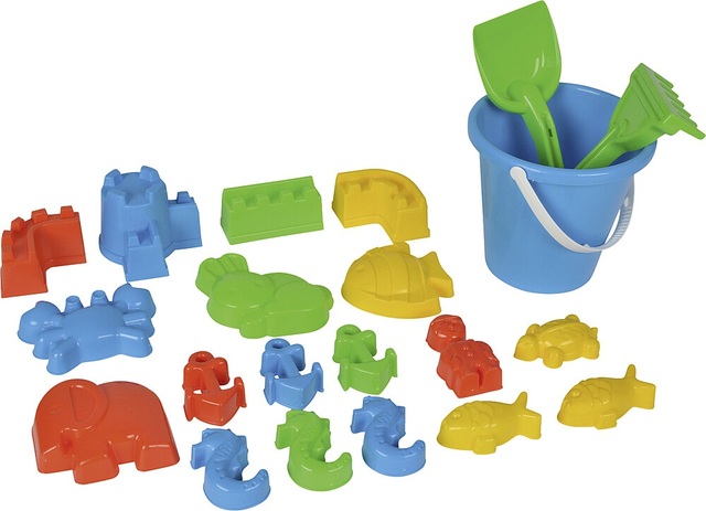 Sandkreation entstehen lassen. Hierzu stehen 18 Sandförmchen, Schaufel, Rechen sowie ein 16cm großer Eimer zur kreativen und motorischen Entfaltung zur Verfügung.