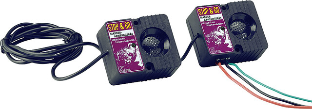 Hochwirksames Ultraschallgerät mit Bordnetzanschluss. Frequenzmodulierte Ultraschalltöne, die dem Marder „höchste Gefahr“ durch tierische Angst- und Warnschreie signalisieren. Kein Gewöhnungseffekt. Vermeidung von Schallschatten durch zwei Lautsprecher. Besonders geeignet für enge und kompakt verbaute Motorräume.