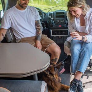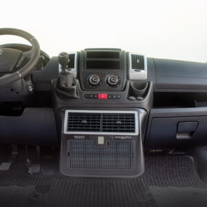 Die ULTRA COMFORT 6000 Klimaanlage besteht aus zwei Einheiten: Die Inneneinheit wird in das Armaturenbrett im Fahrzeuginneren eingesetzt. Die Außeneinheit besteht aus zwei mit einem Schlauch verbundenen Teilen, die hinter der Stoßstange des Fahrzeugs installiert werden.