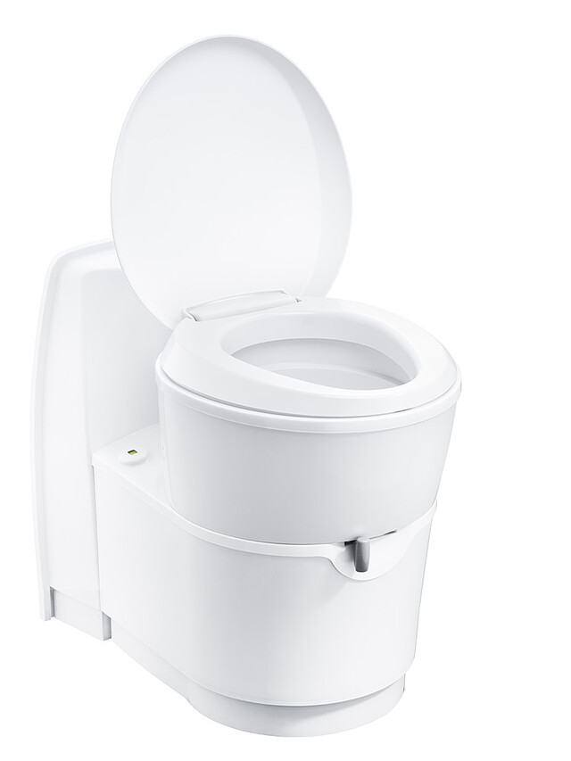 Die C220-Cassettentoilette ist mit einer Toilettenschüssel ausgestattet, die man auf der Toilettenbasis um 2 x 90 ° drehen kann. Das Niederdrücken des Sitzes verriegelt die Toilettenschüssel in der gewünschten Position. Die C220-Cassettentoilette kann freistehend an allen Außenwänden des Fahrzeugs montiert werden. Da Sie die Toilettenschüssel vor der Benutzung drehen können, erfahren Sie optimalen Komfort und verschwenden keinen Platz.