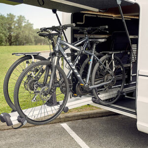 Intelligent und benutzerfreundlich wie kein anderer – der Fahrradträger für bis zu zwei Elektrofahrräder in Ihrer Reisemobil-Heckgarage.