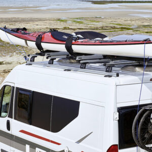Auf den beiden Längsschienen aus stabilem Aluminium können zwei (oder mehr) Lastenquerträger flexibel positioniert werden. Dadurch kann man die Beladung optimal an die Position von Dachaufbauten anpassen.