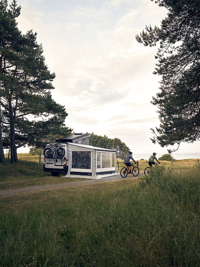 Je nach Markisenlänge variiert das Design der Vorderwand des Zeltes. Große Fensterflächen lassen sehr viel Licht herein und schaffen ein zusätzliches Gefühl der Weite.