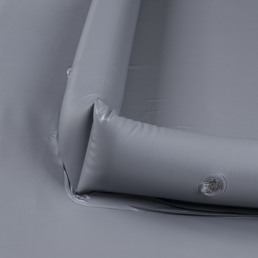 Die Bodenplane verhindert, dank aufblasbarer Seitenränder, das Eindringen von Wasser oder Zugluft in das Vorzelt. Das wasserdichte PVC-Material ist robust und verschleißfest und kann aufgrund der glatten Oberfläche leicht gereinigt werden. Die Ränder können einzeln aufgeblasen werden. An den Ecken befinden sich Ösen, mit denen sich die Plane einfach befestigen lässt.
