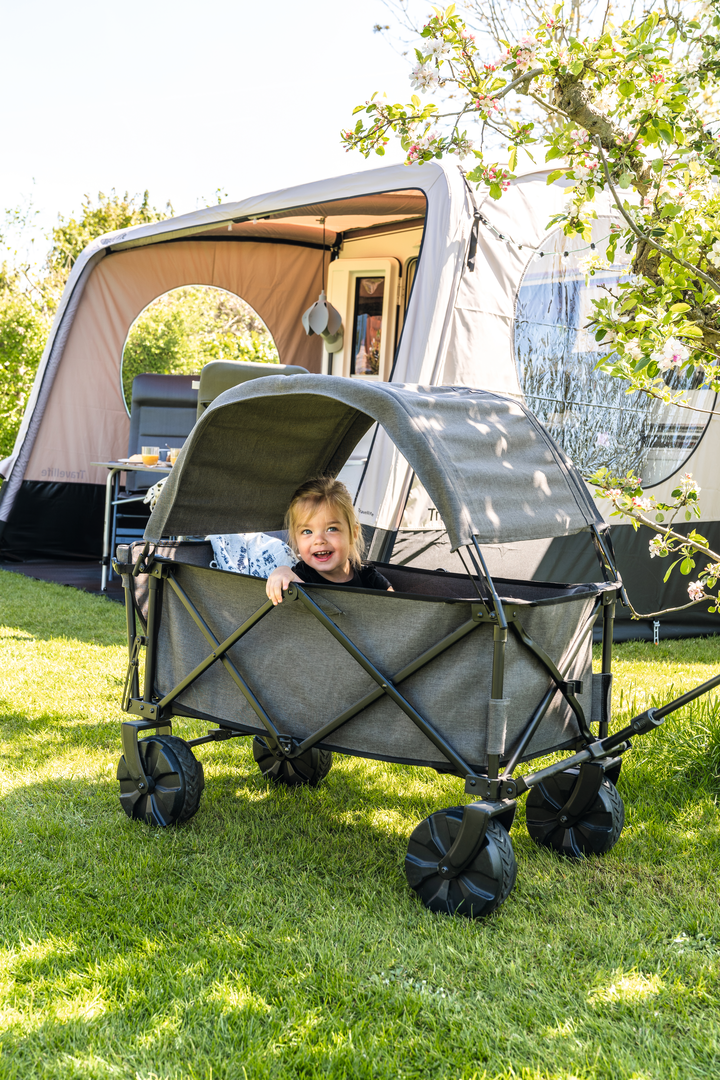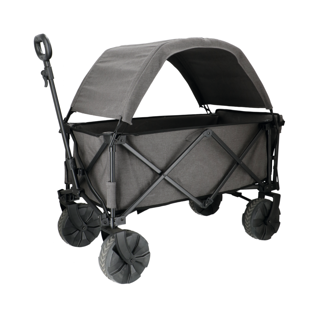 Mit schwenkbaren Kunststoffrädern oder Luftreifen ausgestattet, die maximalen Grip bieten, auch bei Ausflügen auf unbefestigtem Untergrund. Alle Wagen sind aus einem wetterfesten Gewebe gefertigt und mit einer wasserabweisenden Beschichtung versehen. Dank des speziellen Faltmechanismus lassen sich die Wagen nach Gebrauch kompakt zusammenfalten, im Staukasten, im Kofferraum oder in der Garage verstauen und aufbewahren.