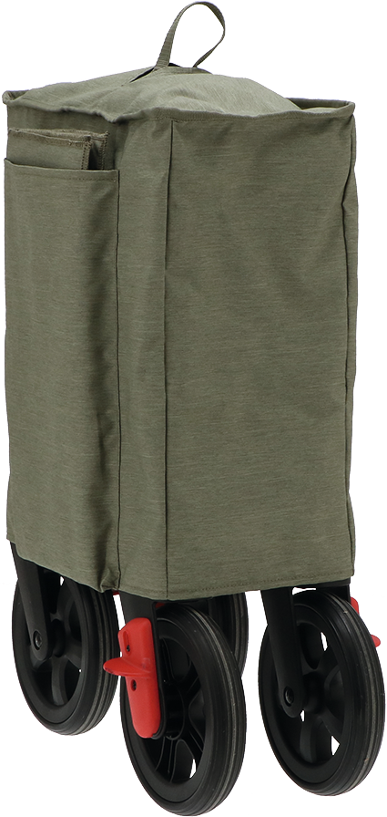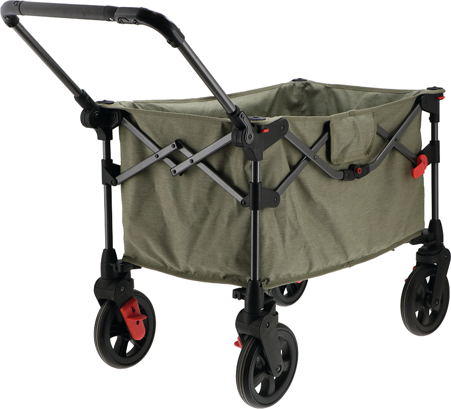 Mit positionierbarem Schiebegriff, 2 schwenkbaren Rädern an der Vorderseite, feststehenden Rädern mit Bremsen an der Hinterseite und praktischen Ablagefächern. Leicht und kompakt zusammenklappbar.