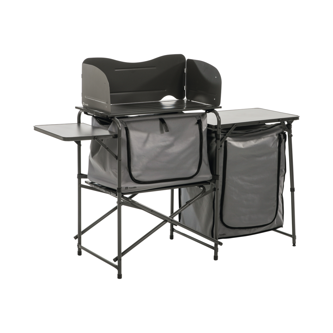 Diese Küche bietet alles, was man braucht, vom Stauraum bis zum Kochbereich. Eine 2-flammige Kochplatte passt problemlos darauf! Die Küche ist außerdem mit einem Windschutz und einem Beistelltisch ausgestattet. Eigenschaften: Kompakt faltbar, Wasser- und UV-beständig, leicht zu reinigen, dank Tragetasche leicht zu transportieren. Belastbarkeit 30 kg. Farbe Dark Grey.