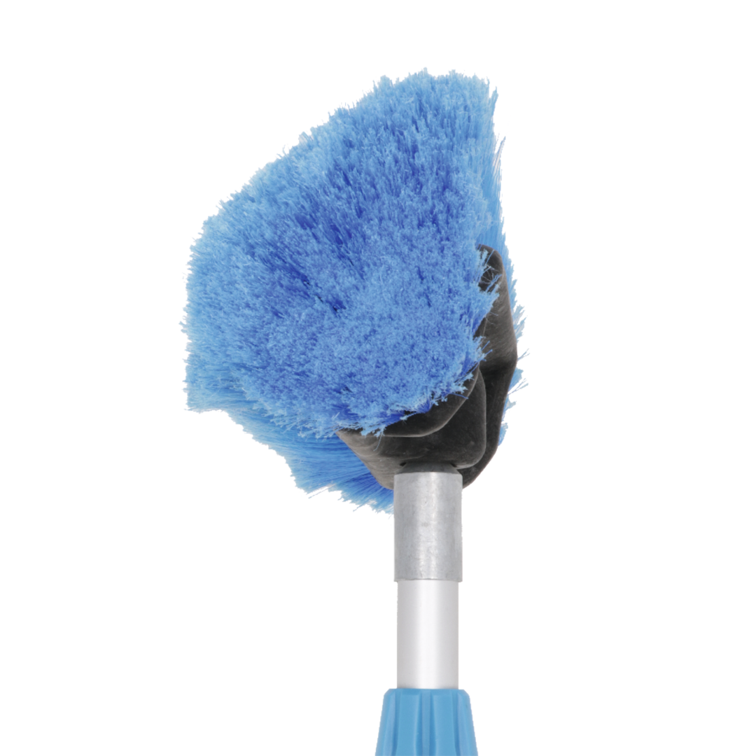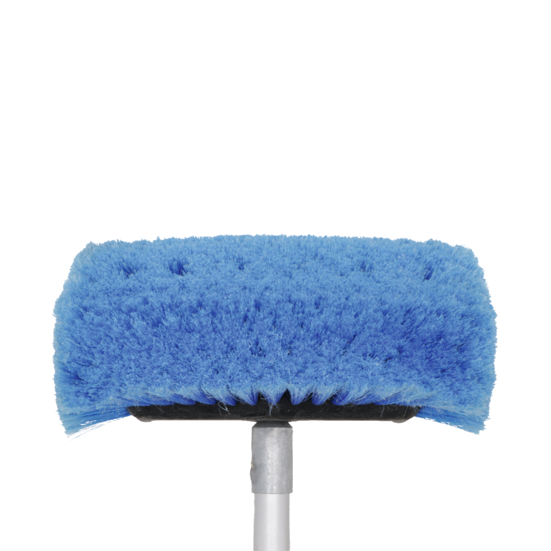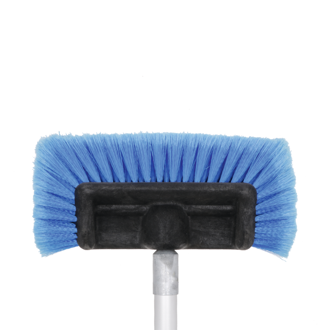 Waschbürste mit Polyesterspitzen und zusätzlichen Seitenbürsten. Eingebauter Shampoo-Anschluss und -Regler, Gardena-Wasseranschluss aus Messing und Alu-Teleskopstab (Länge 135 – 245 cm, ø 30 mm).