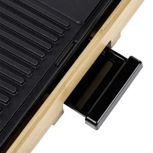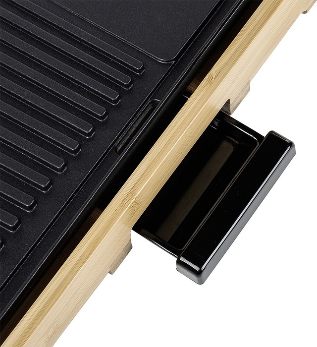 Schön gestalteter Tischgrill mit Bambusveredelung. Mit der kombinierten Teppanyaki & Grillplatte können Sie praktisch jede beliebige Mahlzeit schnell und einfach zubereiten. Auf der Backfläche von 51 x 25,4 cm ist genug Platz für bis zu 6 Personen. Dank 2,2 kW Leistung werden die Platten sehr schnell heiß. Der einstellbare Thermostat lässt sich einfach abnehmen und die Grillplatte so problemlos verstauen. Leichte Reinigung dank spülmaschinenfester Teile.