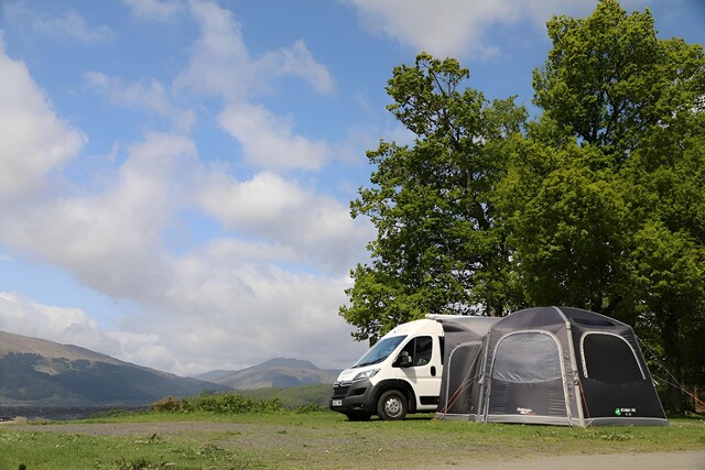 - Aufrollbarer Verbindungstunnel – Nehmen Sie Ihre Markise ab, wenn Sie für den Tag wegfahren, rollen Sie den Tunnel einfach zurück und sichern Sie ihn mit einem Knebel.