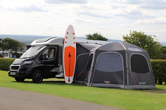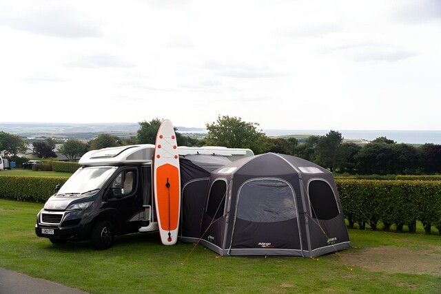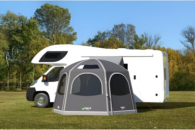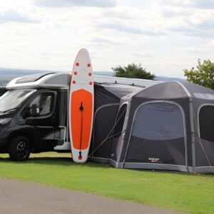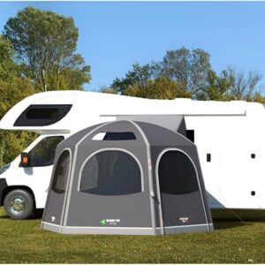 - Aufrollbarer Verbindungstunnel – Nehmen Sie Ihre Markise ab, wenn Sie für den Tag wegfahren, rollen Sie den Tunnel einfach zurück und sichern Sie ihn mit einem Knebel.