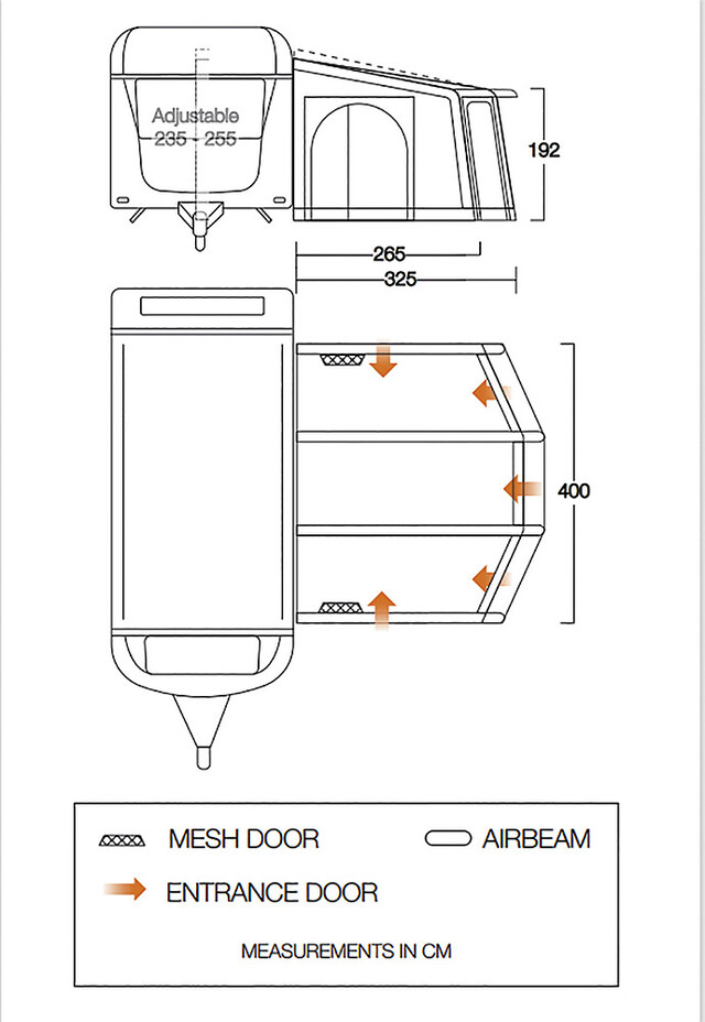 Das aufblasbare Wohnwagenvorzelt Tuscany Air ist mit dem revolutionären S.I.-Pro-System von Vango ausgestattet. Das Vorzelt wird von einem Ventil aus aufgeblasen: mehrere Ventile erleichtern dann den Abbau. Das Tuscany ist mit dem neuen Elements-ProShield-Stoff mit Vango-ColourLok-Technologie ausgestattet, welche die Auswirkungen von UV-Strahlen reduziert. Es ist kein Boden enthalten.