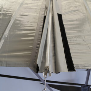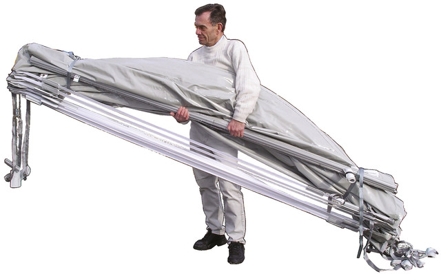 Beispiel: Das Dach für ein sechs Meter langes Mobil wiegt unter 30 kg und misst zusammengerollt ca. 20 cm Durchmesser und drei Meter Länge.