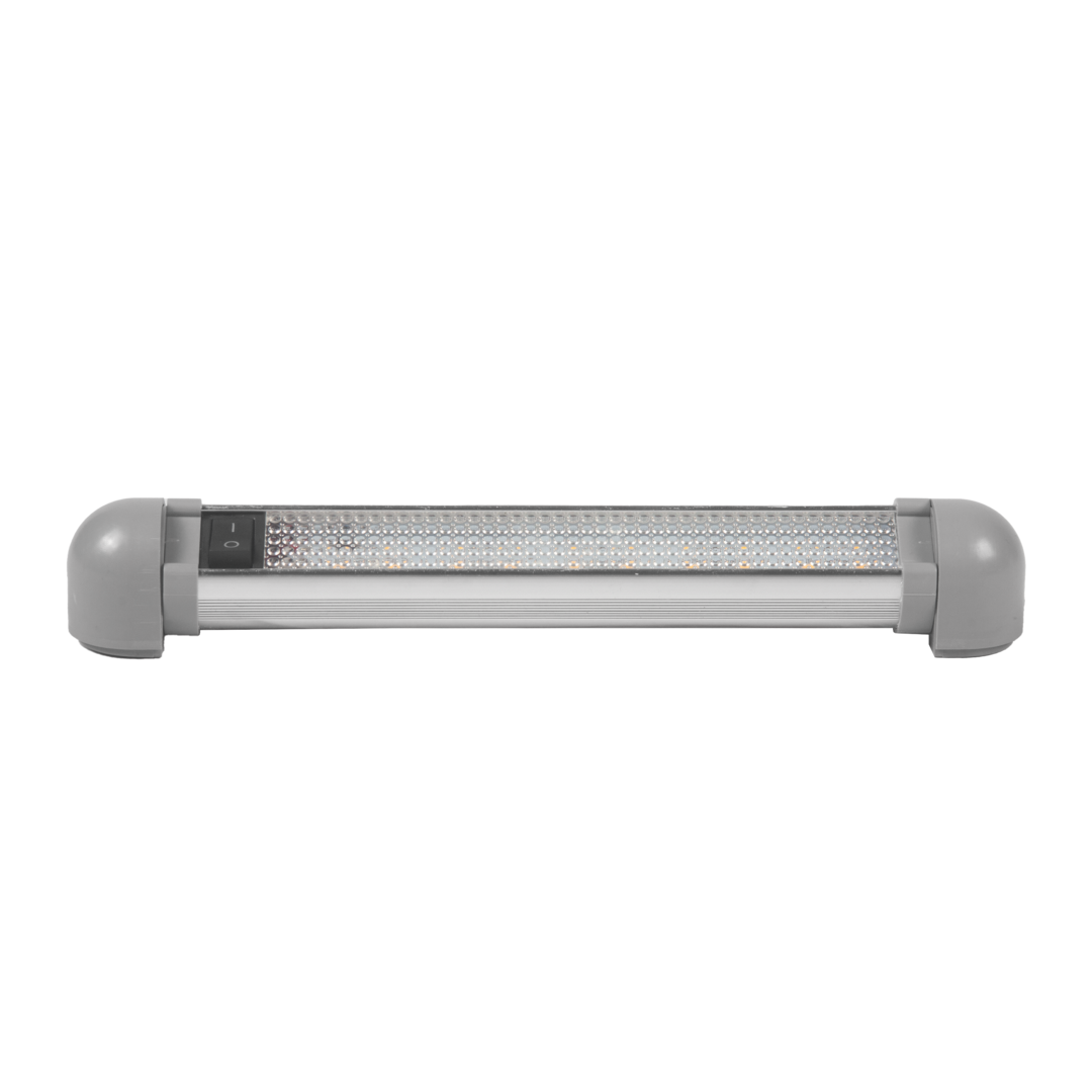 Aufbauleuchte mit 10 LEDs, 180° schwenkbares Aluminiumgehäuse, mit Ein-/Aus-Schalter. Spannung 12 V, Leistung 2 W, Lichtfarbe 3000K, Lichtstrom 170 lm.