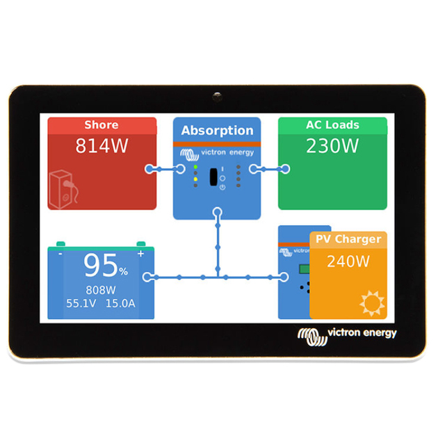 GX Touch 50 ist ein Bildschirm für den Cerbo GX. Die fünf-zöllige Touchscreen-Bildschirm bietet einen sofortigen Überblick über Ihr System und ermöglichen die Anpassung von Einstellungen im Handumdrehen. Sie werden einfach mit einem Kabel an den Cerbo GX angeschlossen. Ihr superschlankes, wasserdichtes Design, der Aufbau von oben und die einfache Installation bringen viel Flexibilität beim Aufbau eines klaren und sauberen Armaturenbretts.