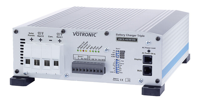 Wie Baureihe VBCS Triple, jedoch ohne MPPT-Solar-Laderegler Stattdessen mit intelligentem Ladestromverteiler für hohen Ladestrom 12 V / 10-15 A zur schnellen Ladung der Starter-Batterie und Versorgung der 12 V-Verbraucher bei Netz-Ladung Elektronik feuchtigkeitsgeschützt.