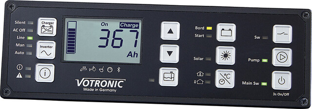 Bord- und Starter-Batterie werden per Spannungsanzeige kontrolliert. Die Leuchtbalken ermöglicht dabei eine sehr genaue Darstellung der Batteriespannung, weil auch Zwischenwerte durch unterschiedliche Leuchtkraft benachbarter LED’s hervorragend ablesbar sind. Auf Tastendruck wird entweder die Bord- oder Starter-Batterie dauerhaft angezeigt oder die Anzeige abgeschaltet. Im ausgeschalteten Zustand sind das Info Panel Pro und die angeschlossenen Tankgeber komplett stromlos. Die Füllhöhen der Tanks werden ebenfalls als übersichtliche Leuchtbalken mit jeweils 10 Leuchtdioden dreifarbig dargestellt, was die genaue Erfassung des Tankinhaltes auf einen Blick ermöglicht. Die Anzeigen arbeiten ebenso stufenlos mit variabler Helligkeit, so dass auch Füllstände wesentlich genauer abzulesen sind als bei herkömmlichen, meist nur 5-stufigen Anzeigen. Bleibt die jeweilige Tankanzeige dauerhaft eingeschaltet, vermittelt die stetig steigende oder fallende Anzeige ein direktes Abbild des aktuellen Tankinhaltes. Sehr hilfreich beim dosierten Füllen des Frischwassertanks.