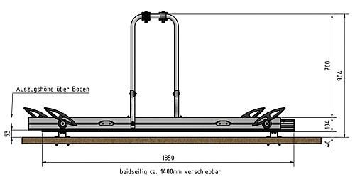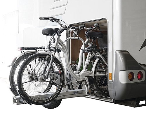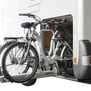 Heckgaragen Fahrradträger Slide Move HG-250 mit Radschalen für die Hinterräder und 2 Radgabelhalter für die Vorderachse (Vorderrad ausgebaut). Beidseitig ausziehbares Trägersystem für 2 Fahrräder. Ideal für Mobile mit 2 Türen. Der Träger wird mit Querverschiebeprofilen am Fahrzeugboden verschraubt. Durch die zusätzliche seitliche Verschiebemöglichkeit in der Heckgarage können die Fahrräder nach dem Beladen platzsparend zur Seite geschoben werden.