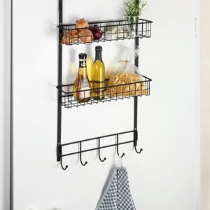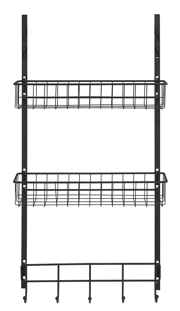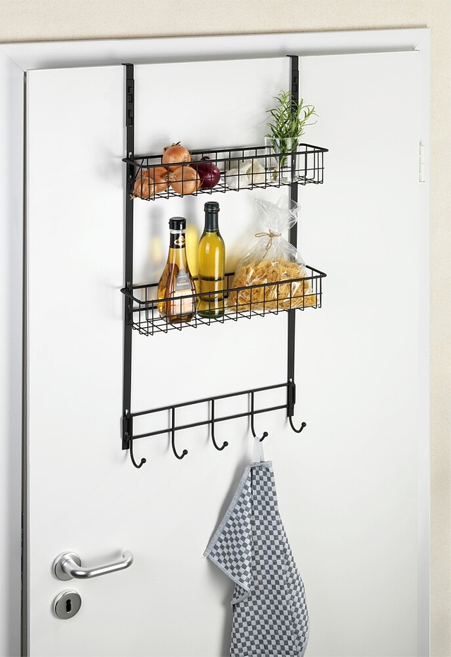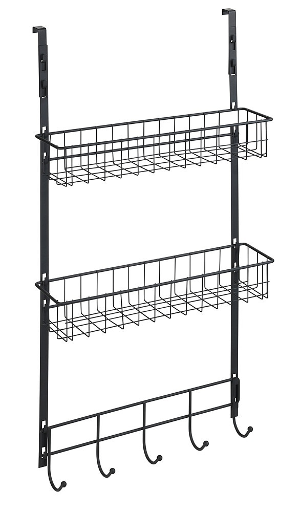 Praktisches Hängeregal für Türen in Bad, Küche und Vorratsraum. Mit 2 Ablagekörben und 5 Haken bietet es zusätzlichen Stauraum.