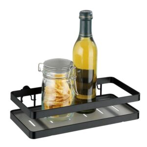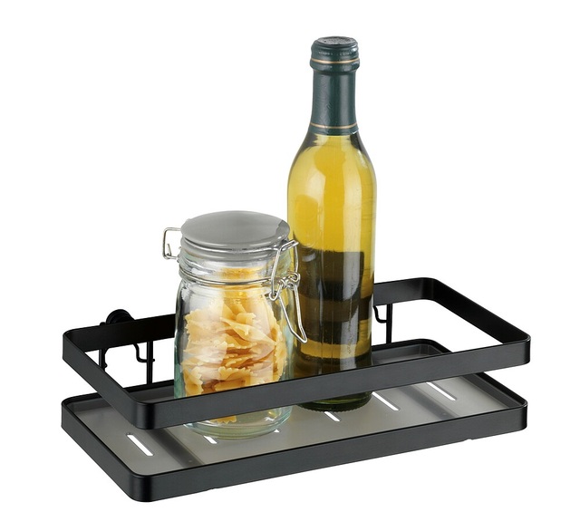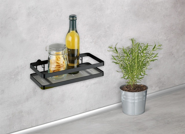 Zur platzsparenden Aufbewahrung von Küchenutensilien. Elegantes Design dank schwarzem Flachstahl mit Kunststoffboden. Alternative Befestigung auch ohne Bohren möglich.