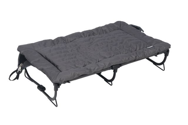 Ein besonderes Highlight: Nach Gebrauch verwandelt sich das Bett im Handumdrehen in eine praktische Tragetasche. Einfach Auflage falten, Gestänge zusammenklappen, hineingelegt und zusammengeschnürt – fertig für den nächsten Ausflug.