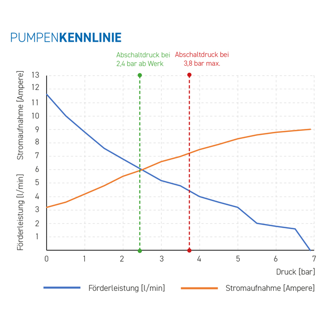 Abschaltdruck: einstellbar von 1,9 – 3,8 bar (Voreinstellung 2,4bar)