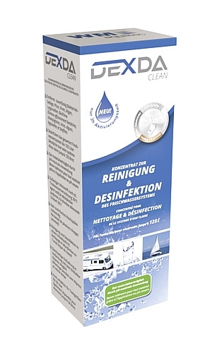 DEXDA Clean eignet sich hervorragend zur Biofilmentfernung und Desinfektion von Wassersystemen in Freizeitmobilen, zur Legionellen Bekämpfung in Flüssigkeit führenden Systemen in Gebäuden oder der Industrie, sowie zur bedarfsgerechten Dosierung, um Trinkwasser zu desinfizieren. Zum Reinigen bzw. Desinfizieren von Frischwassersystemen genügt eine Flasche Konzentrat 1000 ml bis ca. 500 Liter Tankgröße, 250 ml bis ca. 160 Liter Tankgröße, bzw. 100 ml bis ca. 50 Liter Tankgröße.