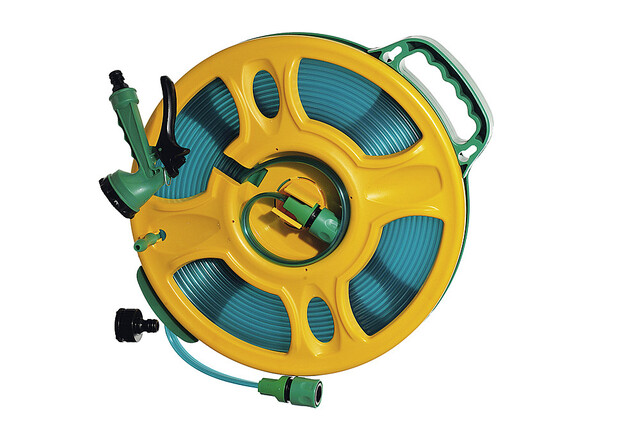 Sehr stabiler 3-Kammer Flachschlauch, der zum Gebrauch nicht abgerollt werden muss. Leicht drehende Trommel mit Tragegriff, knickt nicht und leicht zu verstauen. Mit Sprühdusche und 2 Schnellkupplungen für ¾” Wasserhahnanschluss.