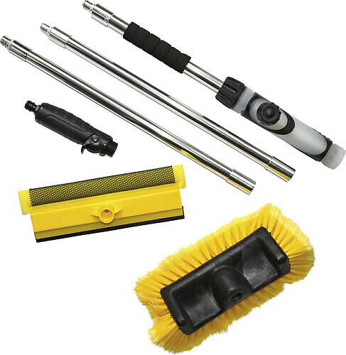 30 cm Waschbürste mit Seitenborsten, 3-teiliger Aluminiumstiel (Länge 50-160 cm Durchmesser: 22 mm, Stärke: 0,8 mm), Fensterabzieher, 100 ml Seifenspender und Metallverbinder. Mit Wasser-Durchlauf-System.