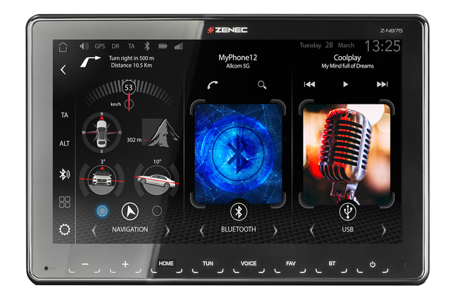Damit sich der Z-N975 perfekt in das Cockpit-Ambiente diverser Fahrzeuge integriert, lässt sich die Beleuchtungsfarbe der Tastenfelder variabel einstellen. Der integrierte DAB+ Doppeltuner mit dynamischer Stationsliste überzeugt mit klarem Digitalradioempfang und komfortabler Bedienung über die großen Sensortasten. Der Z-N975 unterstützt Apple CarPlay und Google Android AutoTM, verfügt über ein umfangreiches Bluetoothsystem, zwei USB-Ports zur A/V Wiedergabe sowie drei Kamera-Anschlüsse mit einstellbaren Hilfslinien und einem Mikrofoneingang (detaillierte Ausstattungsliste siehe gegenüberliegende Seite).